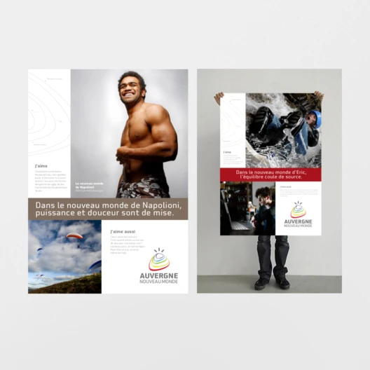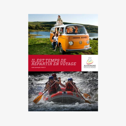 Auvergne Nouveau Monde places travel at the heart of its tourism communication, transforming the tourist into a traveler in search of authentic experiences. An innovative brand identity, accompanied by photo shoots, multilingual brochures, posters and POS, reflects a need for encounters and adventures. This work has helped to renew the image of Auvergne in collaboration with the Regional Council and the Tourism Development Committee, over several years, resulting in a new perception of the destination.